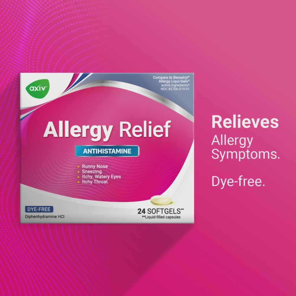 AXIV® Allergy 24 Softgels provides temporary allergy relief of runny nose, sneezing, itching of the nose or throat and itchy, watery eyes; also temporarily relieves runny nose and sneezing due to the common cold.