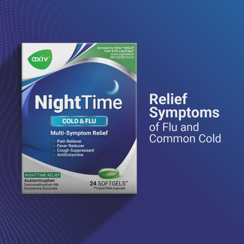 • Nighttime Relief: AXIV NightTime softgels provide relief from flu-like symptoms, promoting better sleep. Temporarily relieves common cold and flu symptoms including cough due to minor throat and bronchial irritation, sore throat, headache, minor aches and pains, fever, runny nose and sneezing.